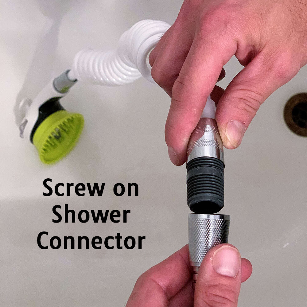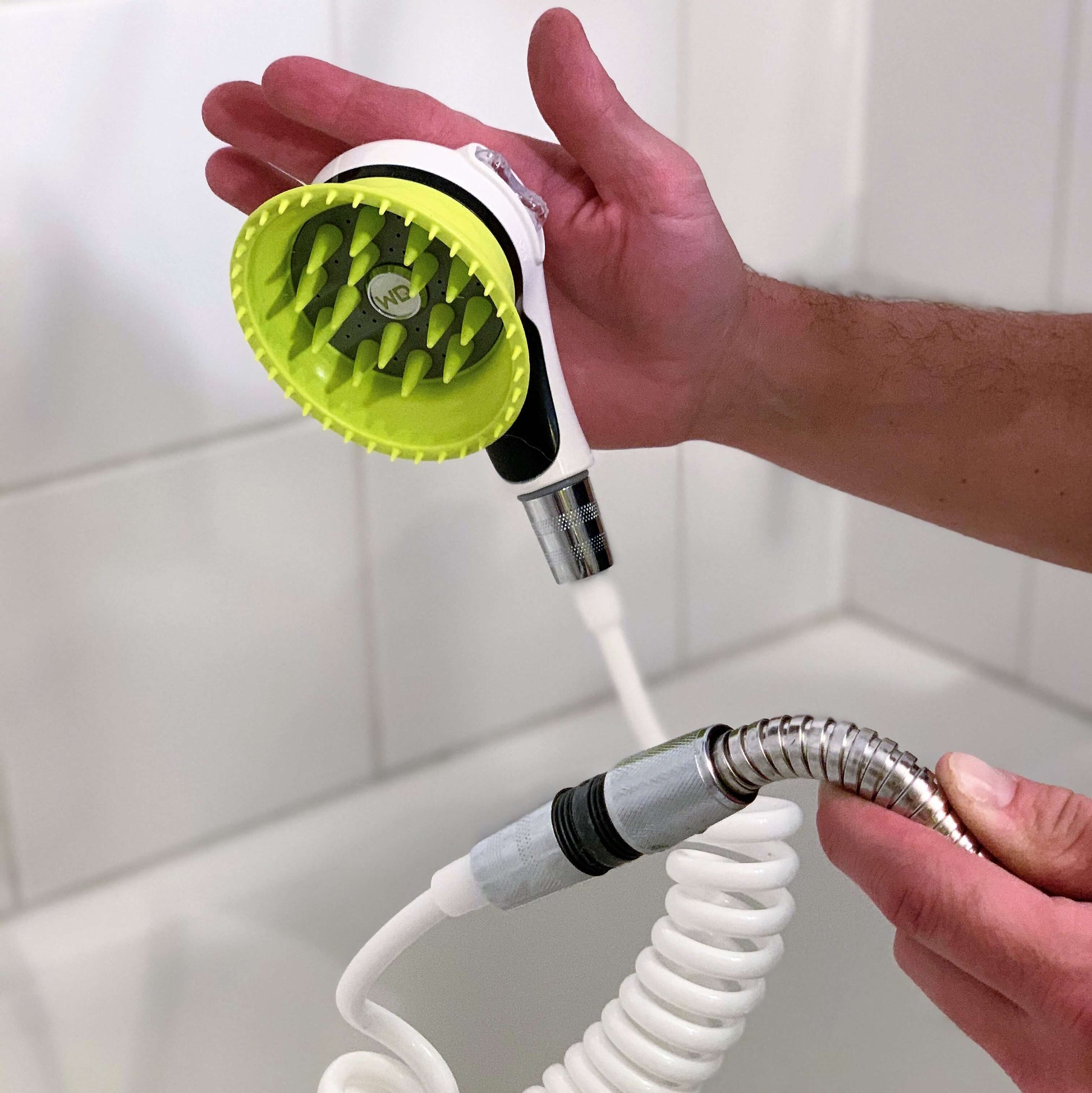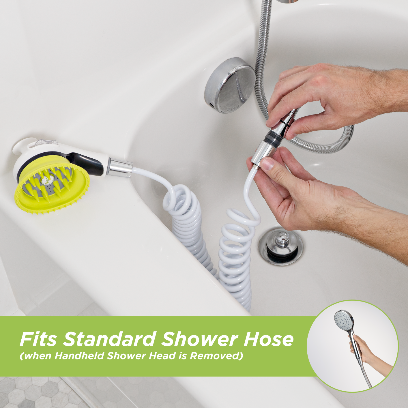 - CONNECTS DIRECTLY TO SHOWER HOSE: This shower brush head and 10ft recoil hose for dog washing screws right into your handheld shower hose. The screw-on shower connector replaces your regular shower handle for easy switching between human shower and dog washing station.