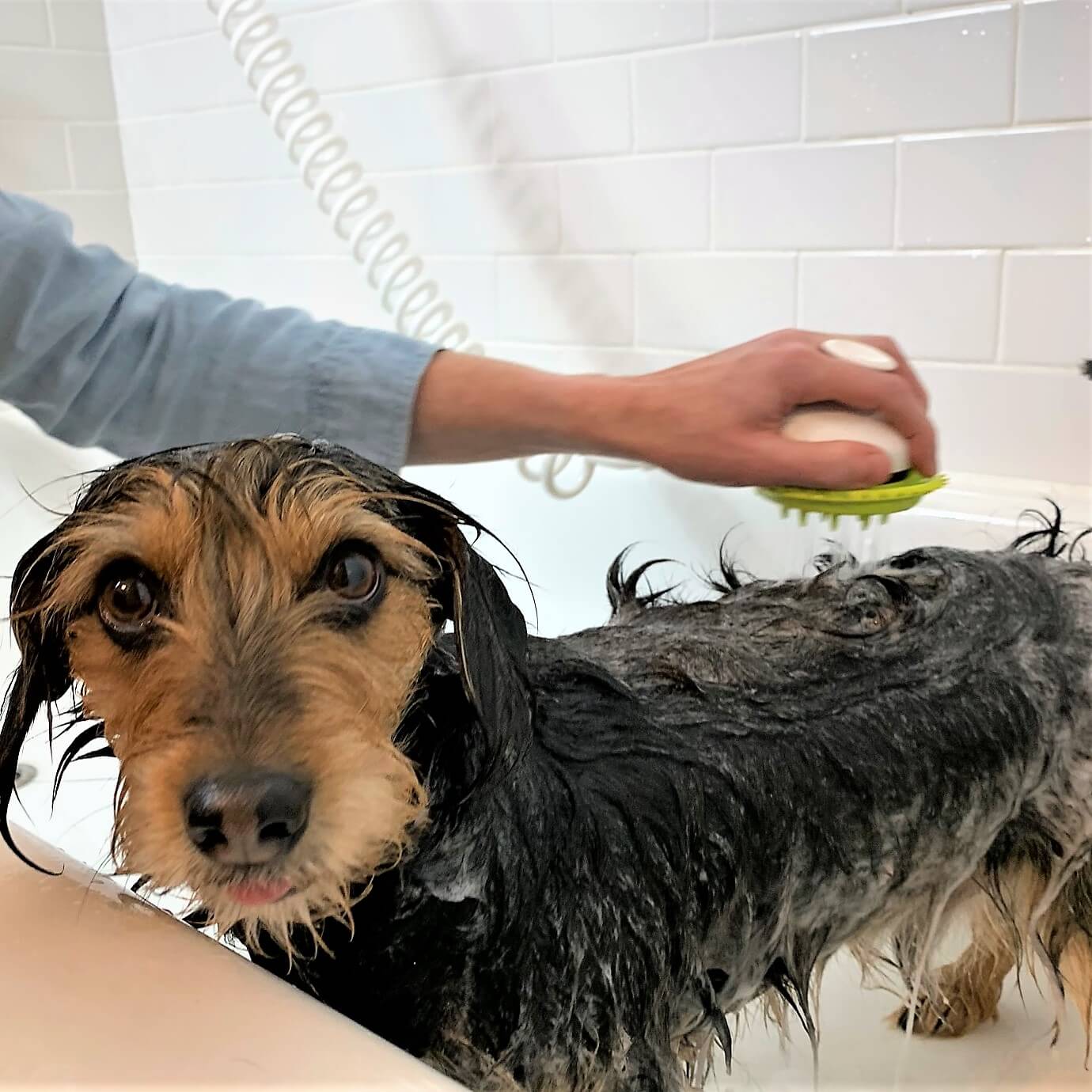 Tired of getting soaked when it should be your dog getting a bath? Do you want a groomer-quality bath without having to leave your home? The Wondurdog Pet Wash Attachment for Handheld Showers is the perfect addition to your dog grooming supplies. Our patented splash shield shower brush keeps the water where you want it and out of your dog's ears and eyes. More control means a deeper and easier clean. The rubber teeth also make this the best long and short-hair dog brush, not only washing out dirt and debris but also soothing and massaging. This shower attachment to wash your dog also includes a 10-foot recoil hose that can be stored in our provided storage bag. The innovative and ergonomic handle design is simple and suitable for anyone: whether it's being used by a young child or an older adult. Plus, you can bathe, brush, rinse, start and stop the water with one hand! Most importantly, this product provides a great opportunity to bond and comfort your dog. Baths can be stressful to some pets, but this gentle and massaging shower brush for dogs will clean and soothe your dog at the same time. Wondurdog believes that bathtime is a special time, so make the moment count!