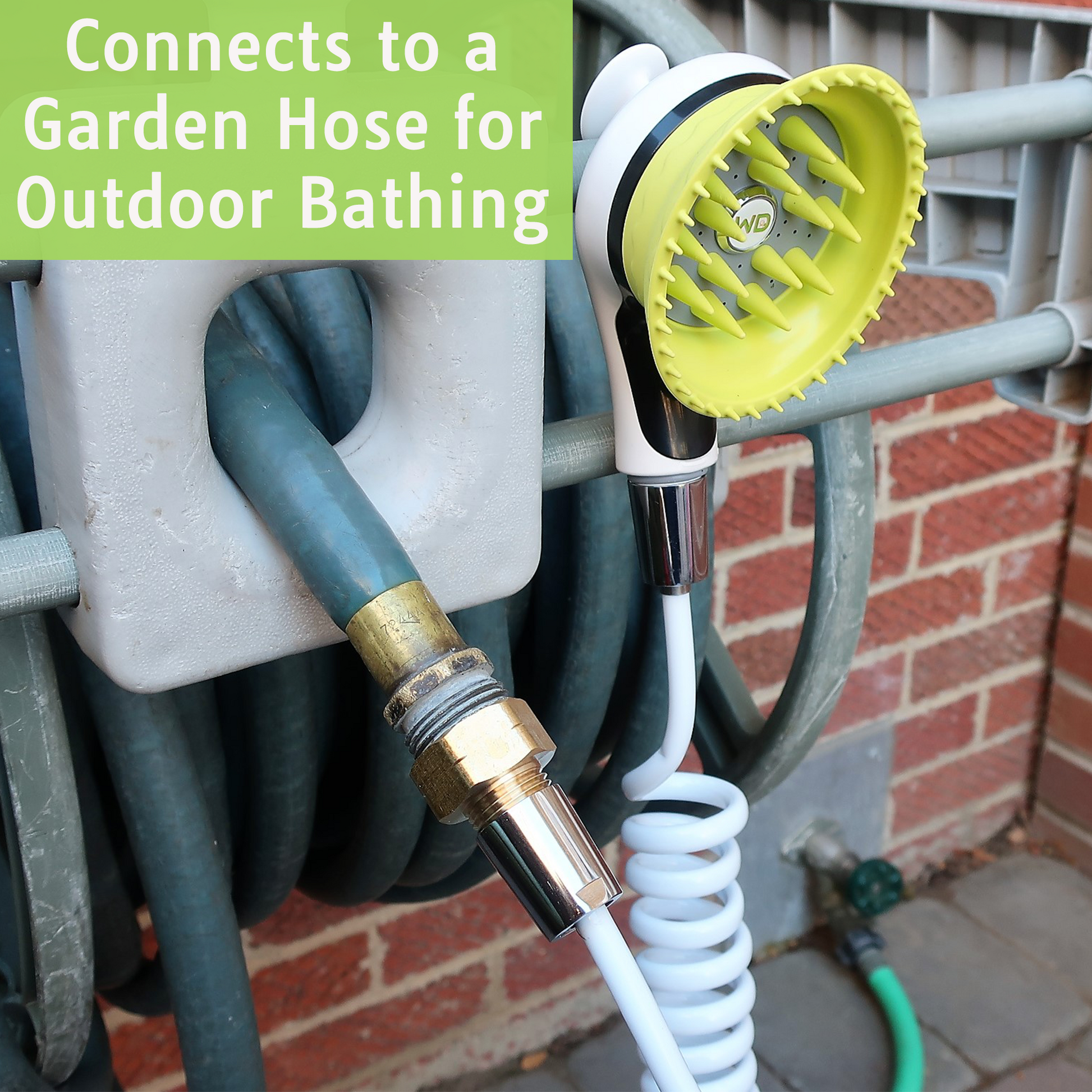 - CONNECTS TO A GARDEN HOSE FOR OUTDOOR BATHING: The kit includes a metal garden hose adapter which allows you to take the bath outside by connecting the recoil hose and shower brush to your garden hose. Enjoy a stress-free and enjoyable bath time!