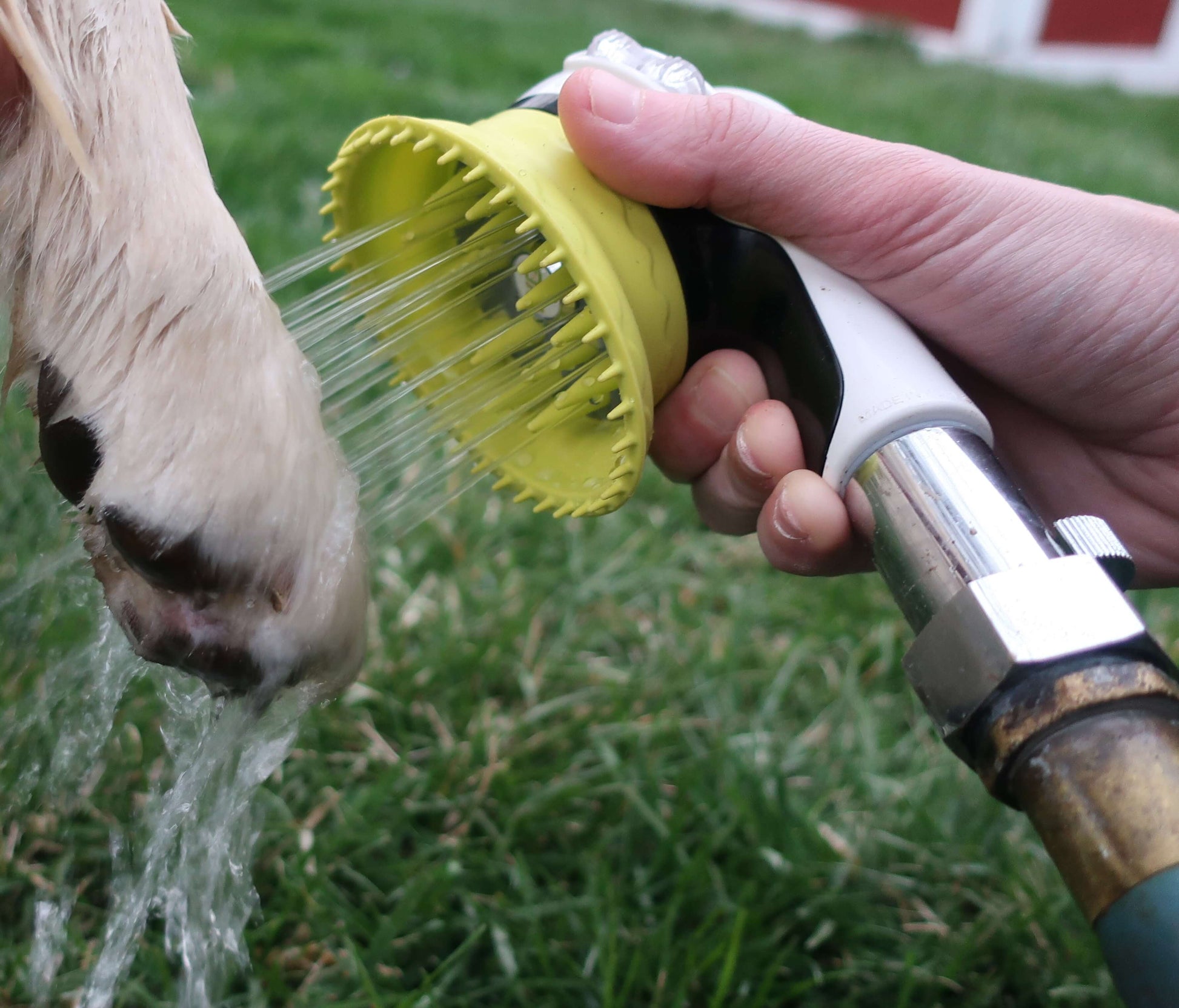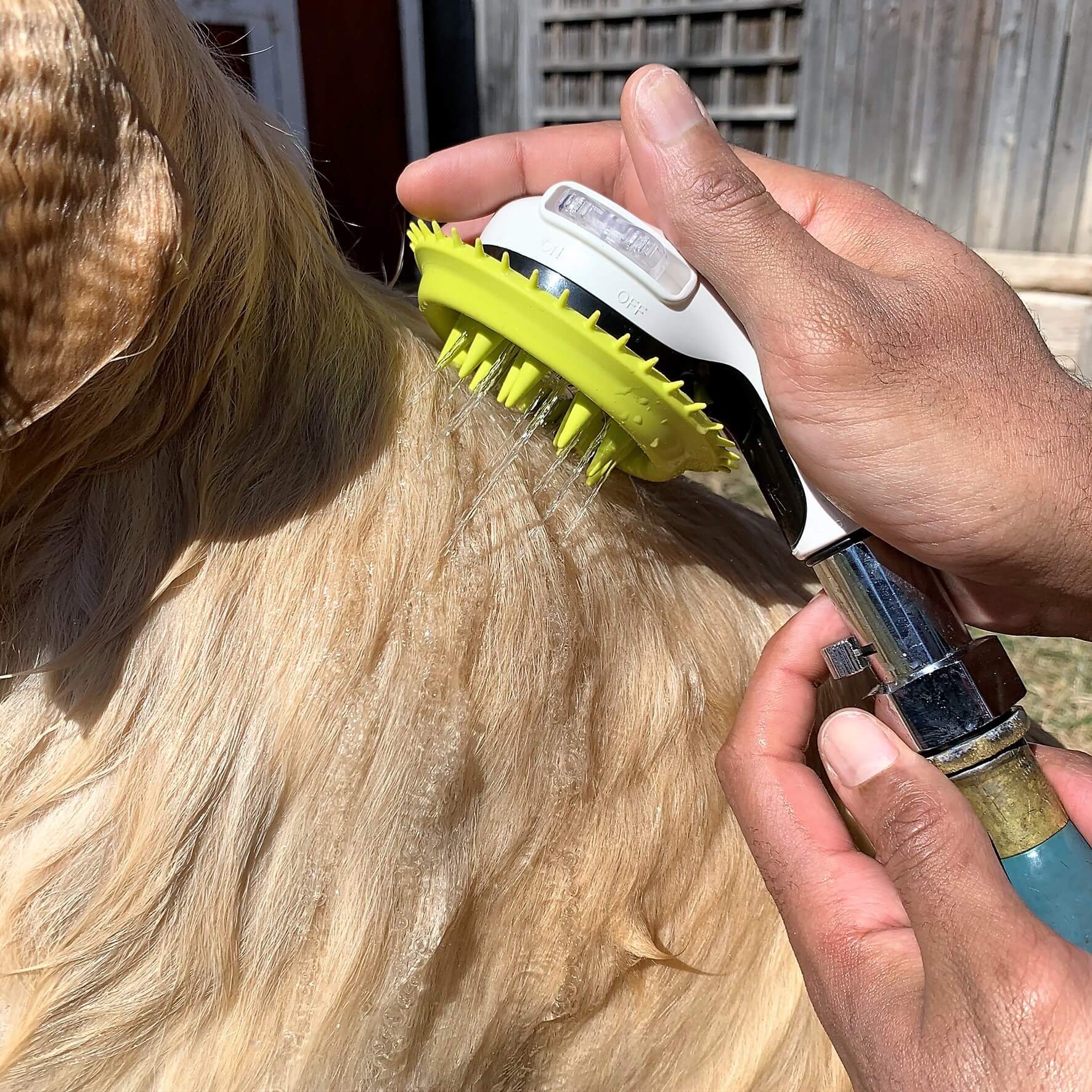 - GREAT FOR ALL AGES: Ergonomic and easy to use, this garden hose sprayer brush leaves you with an extra hand free, so you can soap up and comfort your pet while bathing them. Bathe, brush, rinse, start and stop water with one hand. Plus, it's easy to use for all ages!