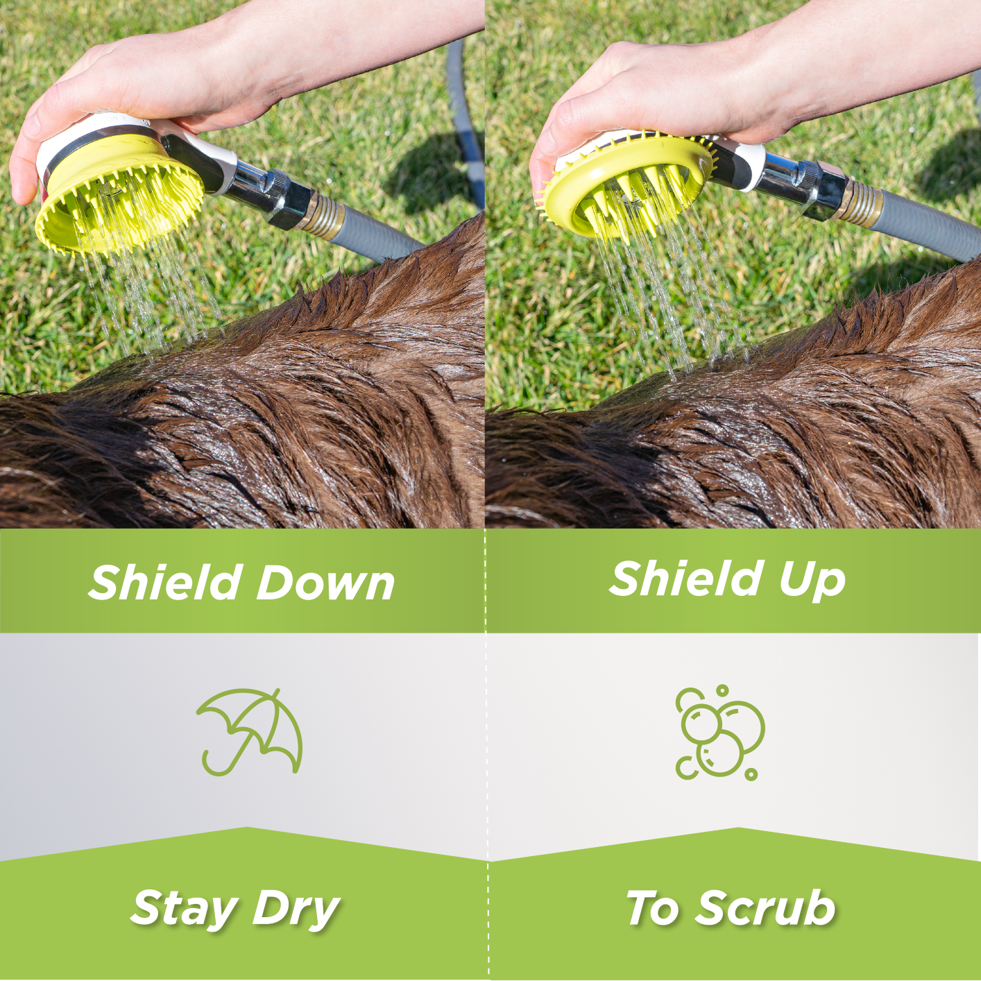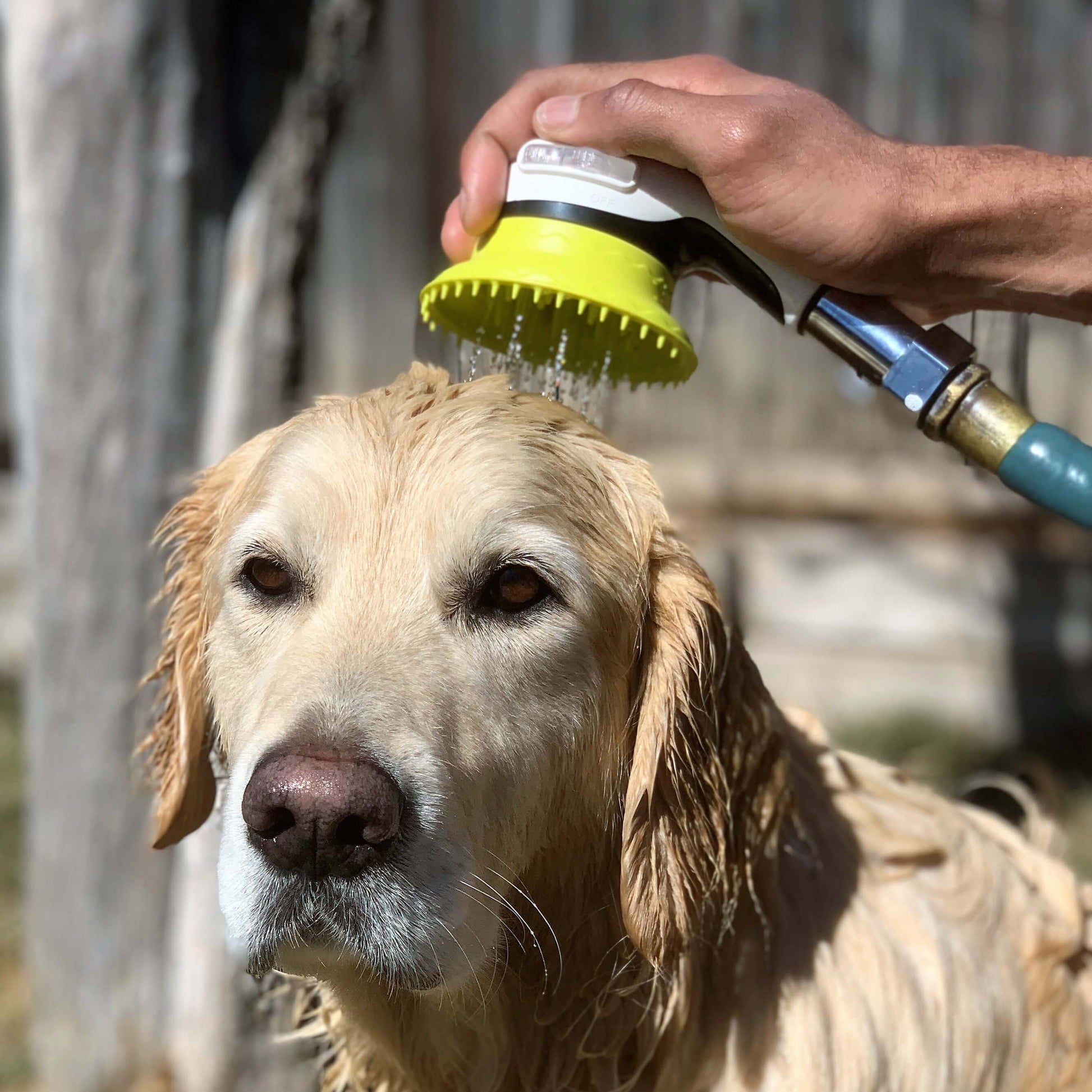 - GREAT FOR ALL AGES: Ergonomic and easy to use, this garden hose sprayer brush leaves you with an extra hand free, so you can soap up and comfort your pet while bathing them. Bathe, brush, rinse, start and stop water with one hand. Plus, it's easy to use for all ages!